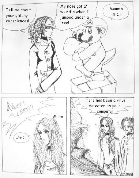 Here is Glitch World, a comic created by Connie (of CGS) about the Center for Glitch studies. Right now we have one installment. Because of the awful events depicted in this story, we currently don't have a working scanner. So, sorry about the low quality; this was taken with my digital camera.