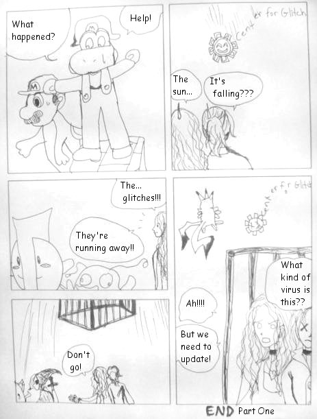 Here is Glitch World, a comic created by Connie (of CGS) about the Center for Glitch studies. Right now we have one installment. Because of the awful events depicted in this story, we currently don't have a working scanner. So, sorry about the low quality; this was taken with my digital camera.